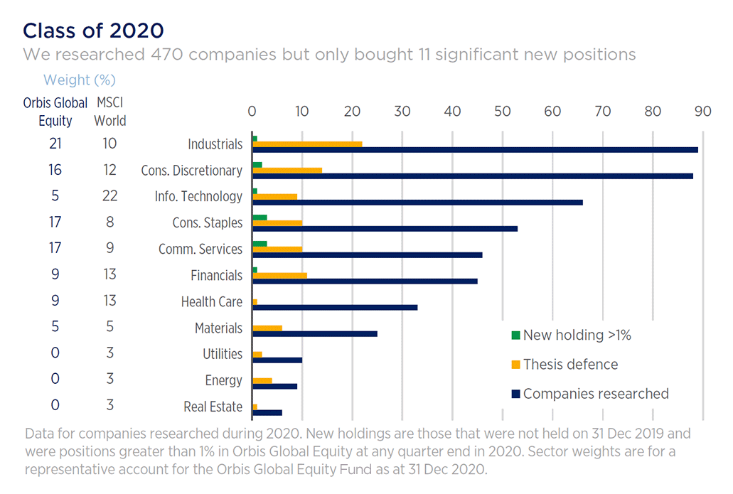Above all, the biggest pattern that emerges is one of extreme selectivity. Of the 470 new ideas that entered our research pipeline, less than 100 were strong enough to be put in front of a broader group of investment professionals in a thesis defence, and among these only 11 became positions larger than 1% in the Orbis Global Equity Fund. That’s a mere 2% “acceptance rate” from the initial pool of candidates – much harder than getting into Harvard!