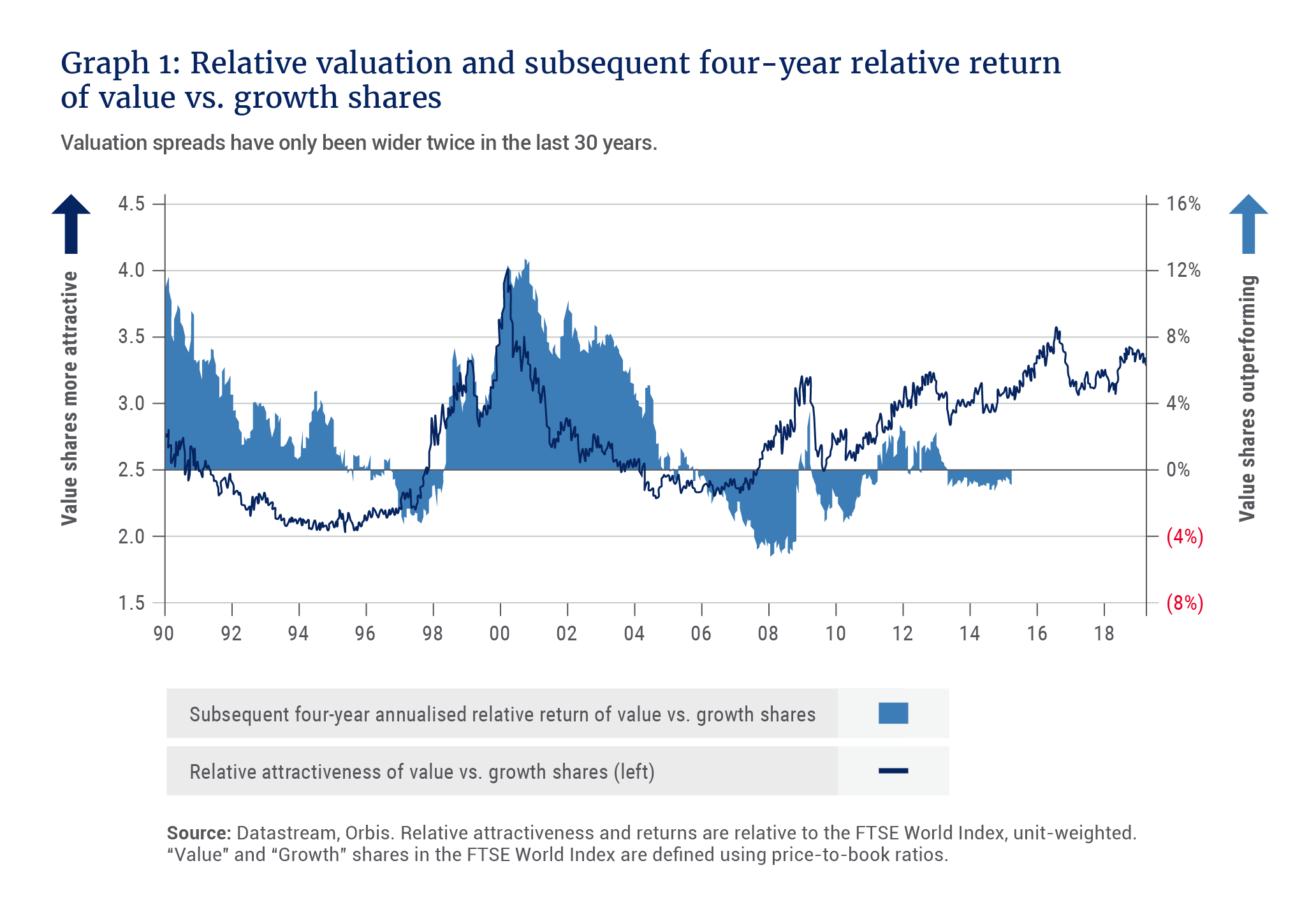 While value shares have done relatively poorly lately, over the long term, investing in value shares has significantly outperformed – compare the area of light blue above the line to the area of light blue below the line. By definition, value stocks are always cheaper than the expensive stocks in the market, but sometimes they are just a bit cheaper, and sometimes they are much cheaper. As the shaded area in the graph shows, hunting for ideas among value stocks is much more rewarding when valuation spreads are wide, as they are today. Thus you should not be surprised that the Orbis Global Balanced Fund’s equity holdings have increasingly tilted toward shares trading at low multiples of their normalised earnings, or low valuations relative to their history. We’ve been holding our noses and adding to what’s currently unwanted, untouchable, and cheap, relying on our fundamental research to fight human nature and buy when others think we’re foolish.